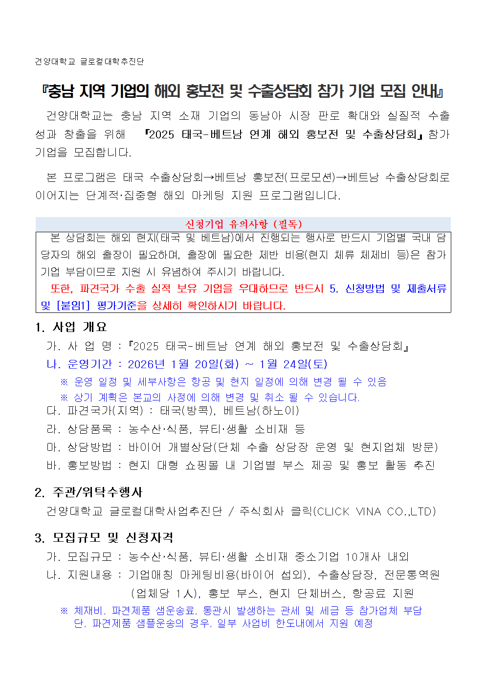 | 제목 | 충남 지역 기업의 해외 홍보전 및 수출상담회 참가 기업 모집 안내 | ||||