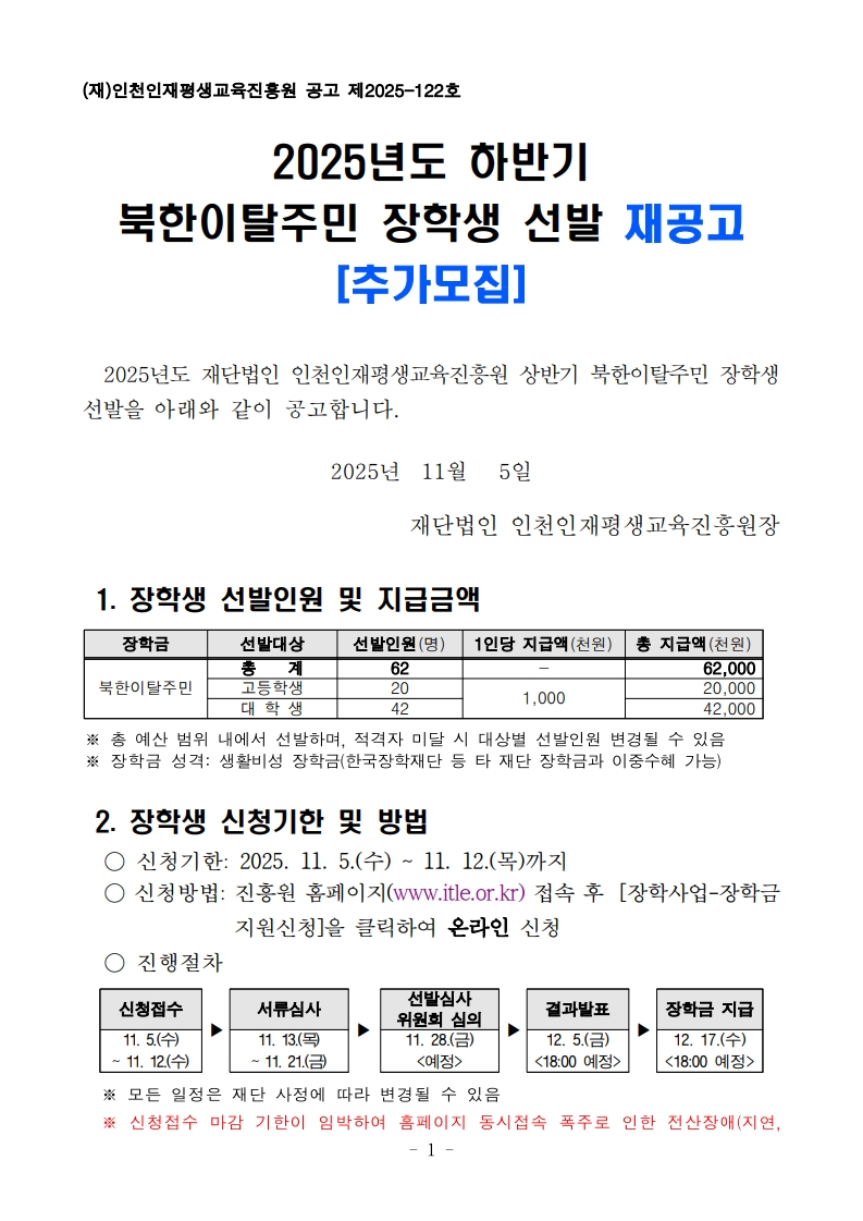| 제목 | 2025년도 하반기 북한이탈주민 장학생 선발 재공고(추가모집) | ||||