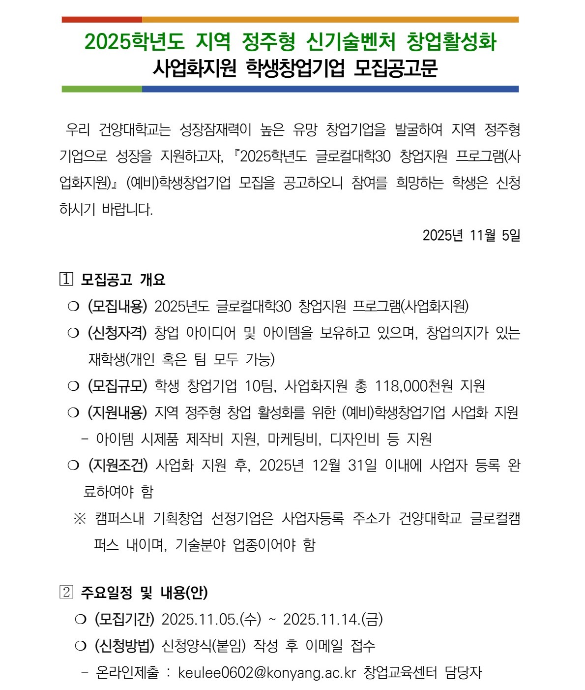 [붙임] 2025학년도 글로컬대학30 창업지원 프로그램(사업화지원) 모집공고문(신청양식 포함).hwp