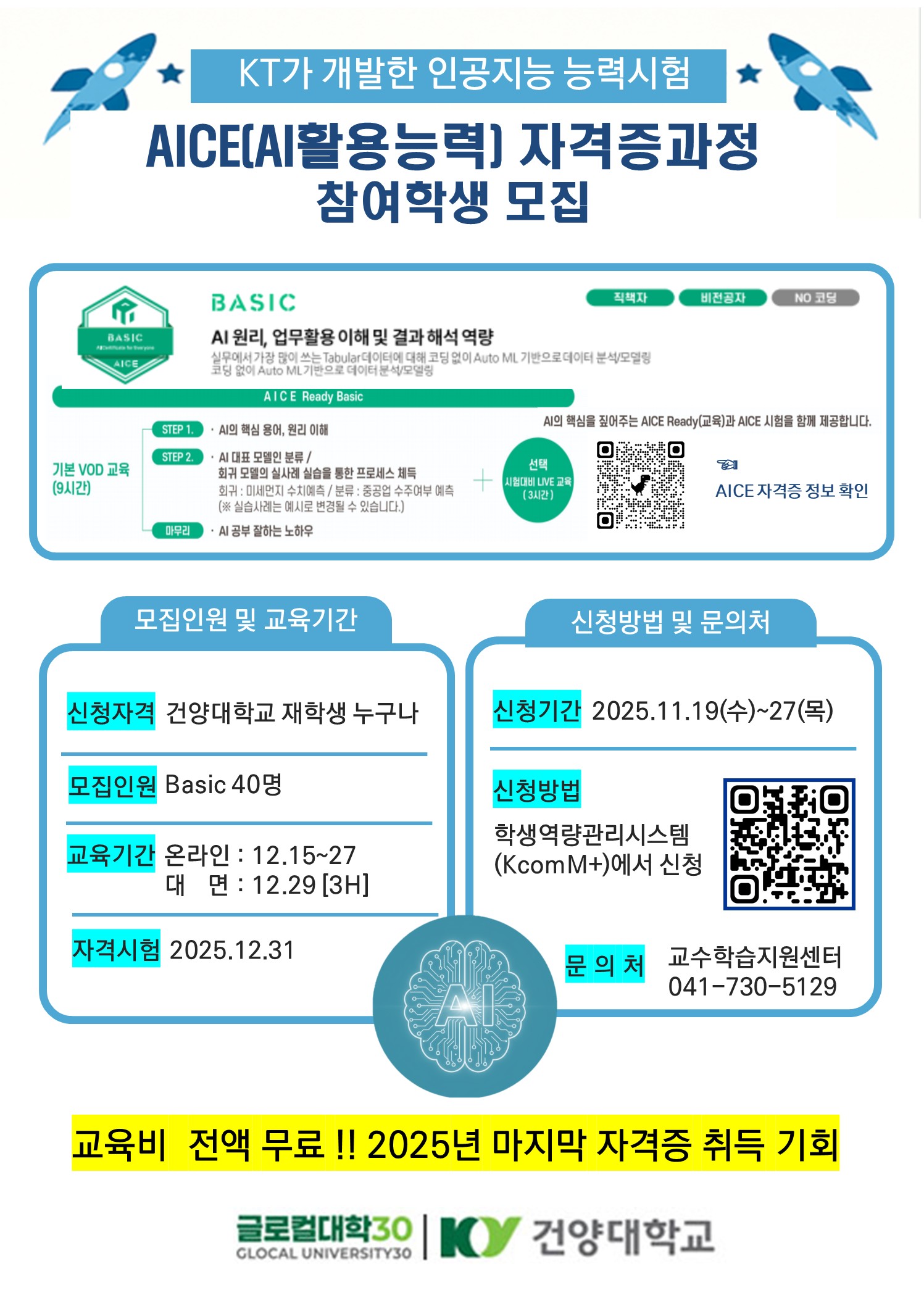 | 제목 | AICE(AI활용능력) 자격증과정 참여학생 모집 | ||||