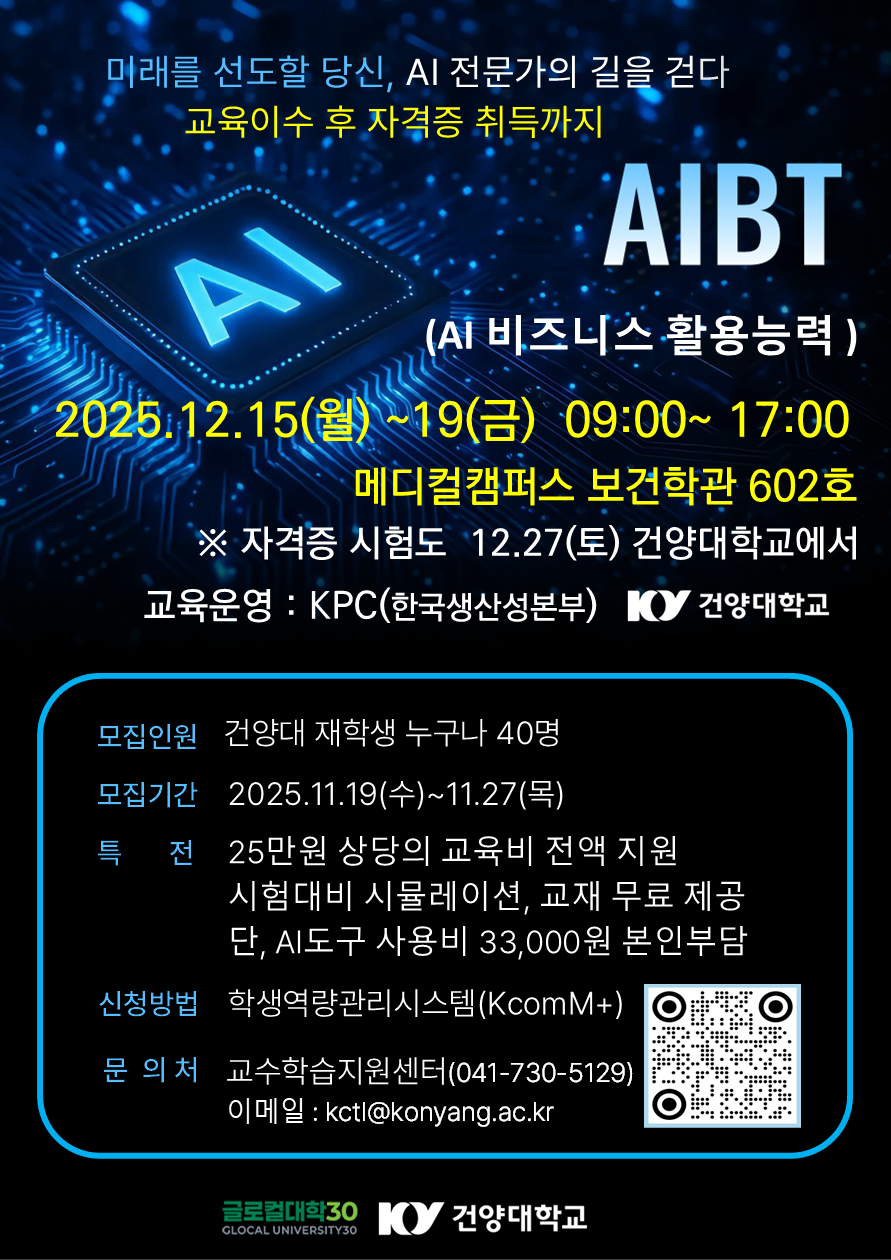 | 제목 | AIBT(AI비즈니스 활용능력) 자격증과정 참여학생 모집 | ||||