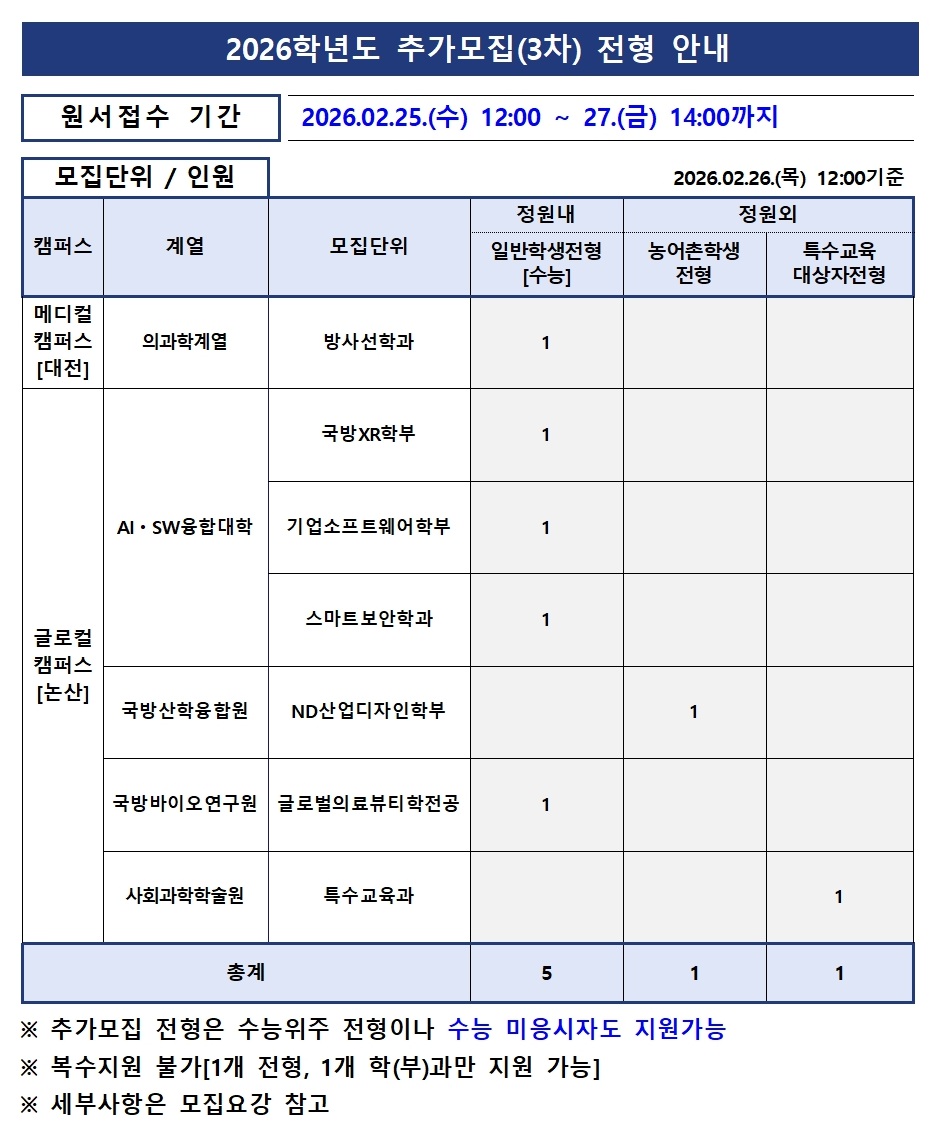| 제목 | 2026학년도 추가모집(3차) 모집요강 탑재 안내(2026.02.26) 이월반영 5차변동 | ||||