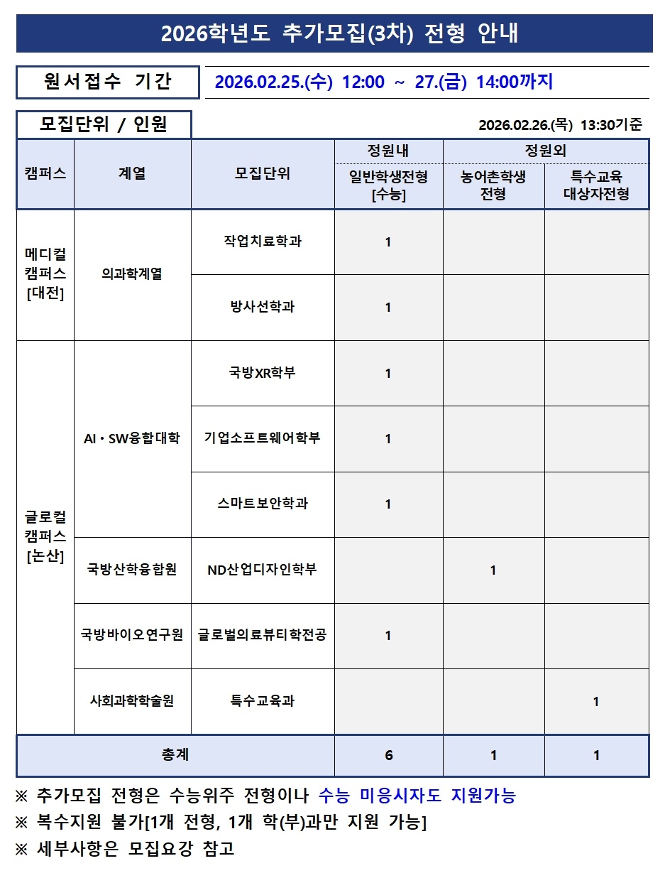 | 제목 | 2026학년도 추가모집(3차) 모집요강 탑재 안내(2026.02.26) 이월반영 6차변동 | ||||